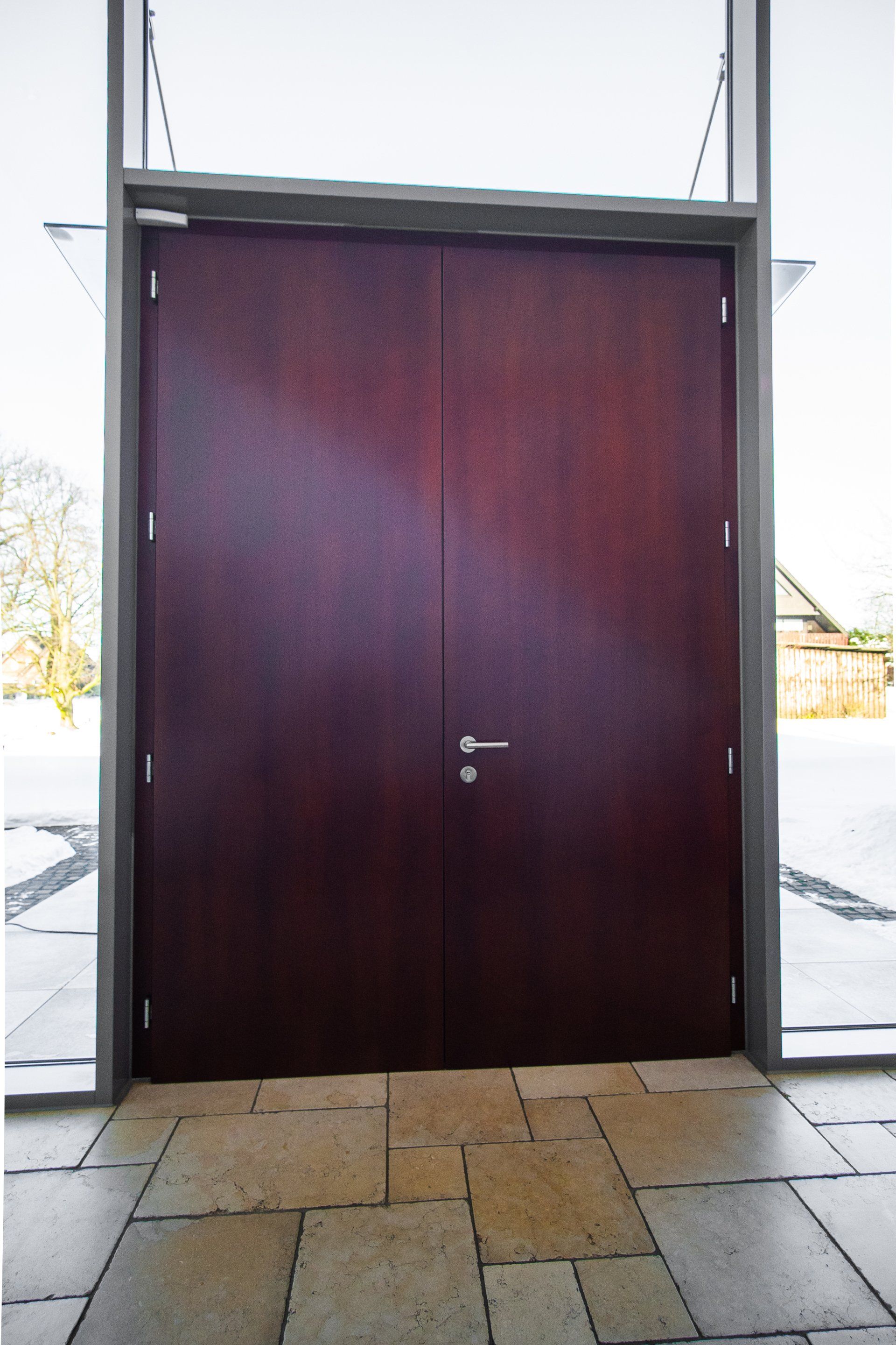 - 3m hohe, doppelflügelige Hauseingangstür aus massivem Mahagoni mit Sicherungseinlage und Sicherungsschlössern