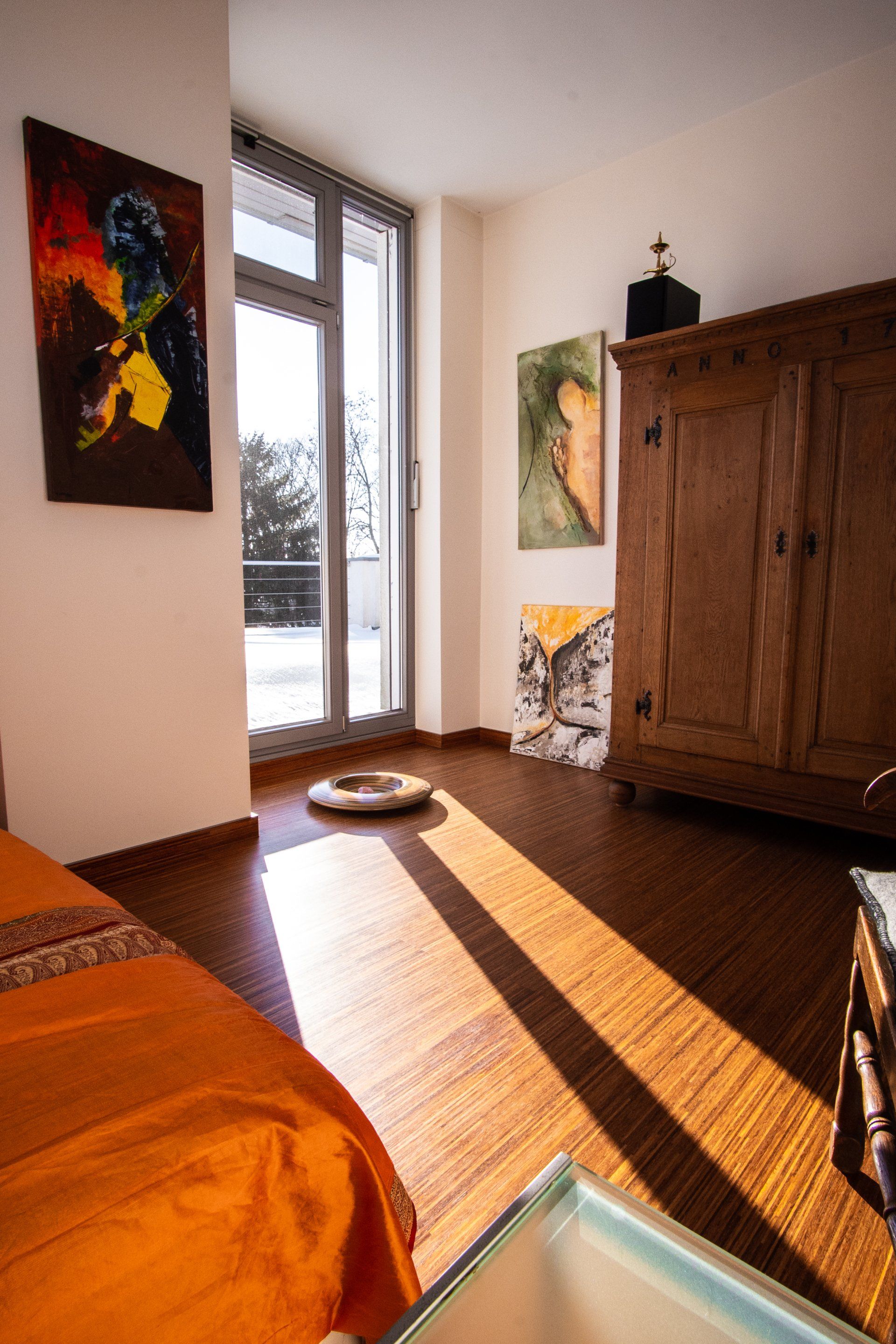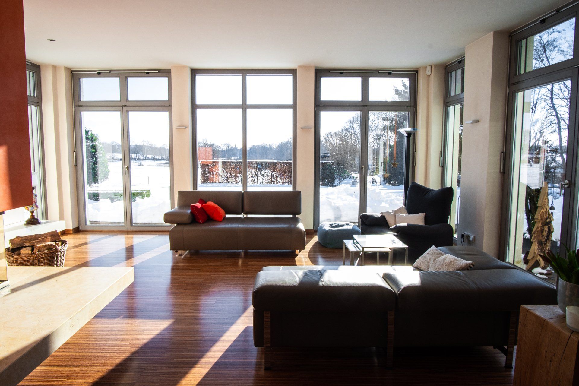 - Holzfenster – Ug-Wert 1,0 W/(m²K) Meranti Mahagoni, grau gestrichen Bodentiefe Fenster (In der Diele ca. 5,7m hoch)