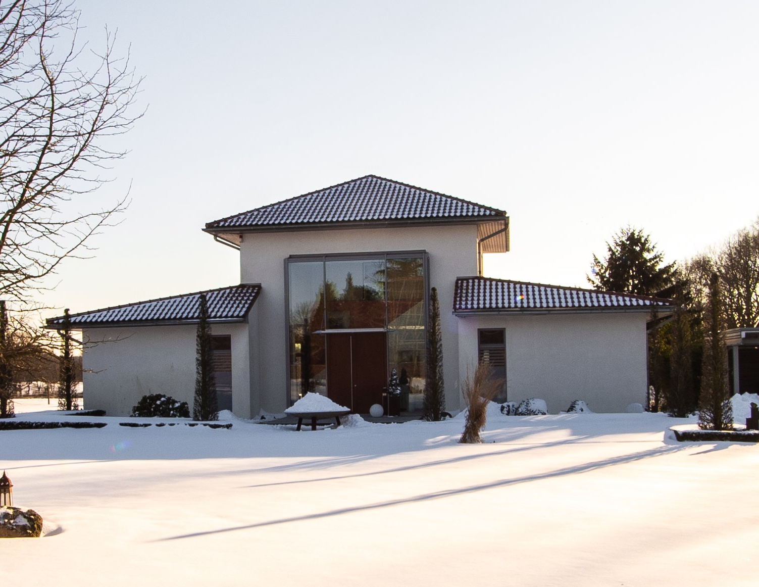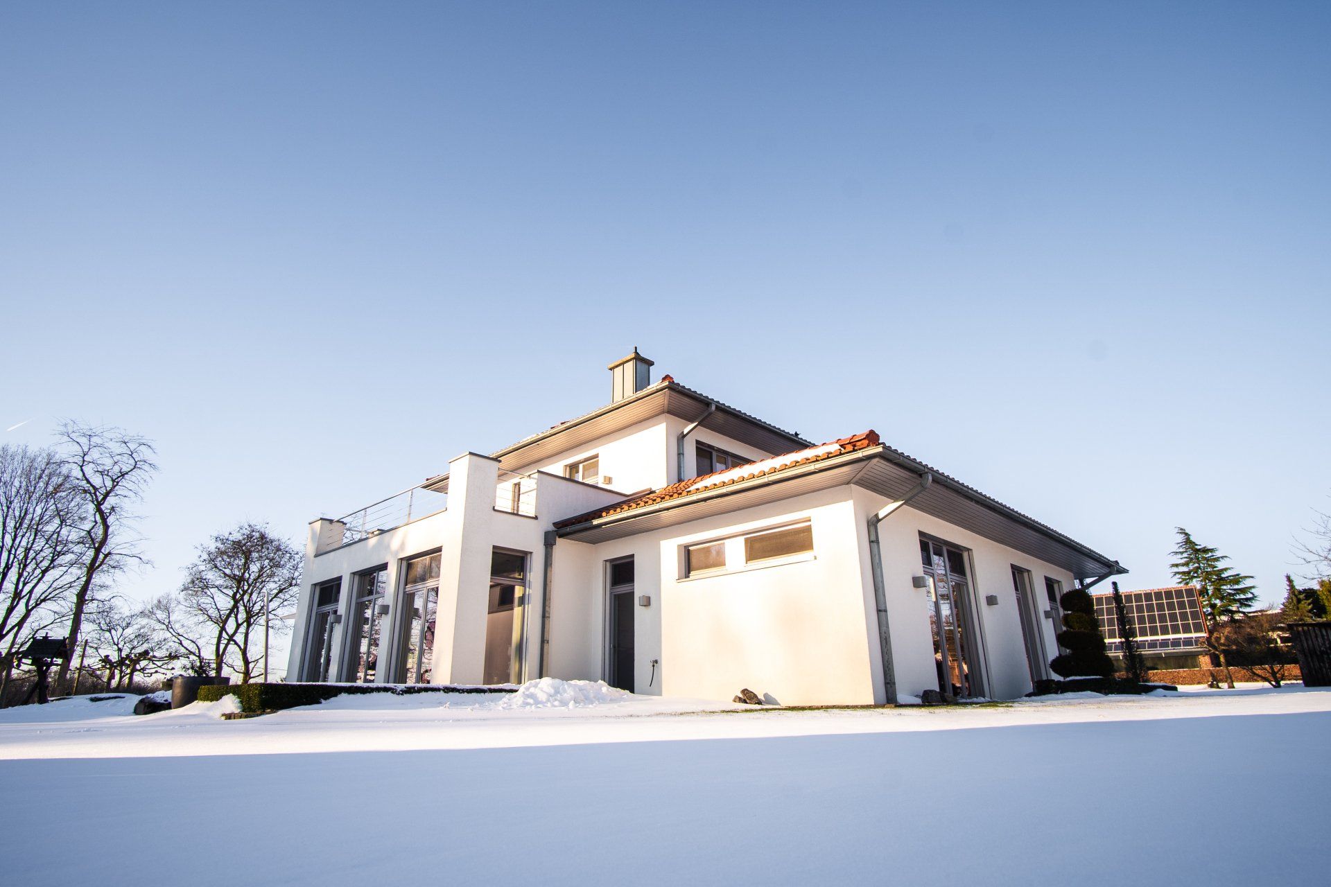 Diese individuell gestaltete Villa mit großzügiger Terrasse im Obergeschoss und weiteren Terrassenflächen im Erdgeschoss, großem Carport sowie einer anspruchsvollen Außenanlage wurde 2004 in massiver Bauweise, einer Außenfassade in Wärmedämmverbundsystem (Dämmung nach Niedrig-Energiehaus-Standard) und einem außergewöhnlichen Dach in Form eines sog. Zeltdaches (ebenfalls Dämmung nach Niedrig-Energiehaus-Standard) erstellt.